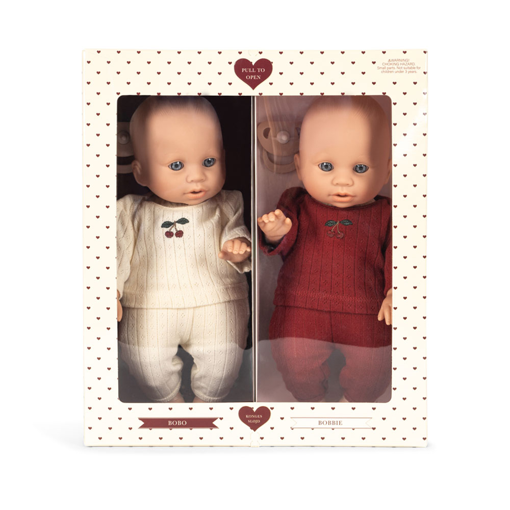 2-pak dukker (One size) To søde tvillingedukker, der kommer i hver sit fine todelte pointellesæt. Tøjet er nemt for barnet at tage af og på dukken. Rengøres med en fugtig klud, brug ikke kemikalier. Højde: 32 cm Velegnet fra 3 år+ MULTI BOBO AND BOBBIE