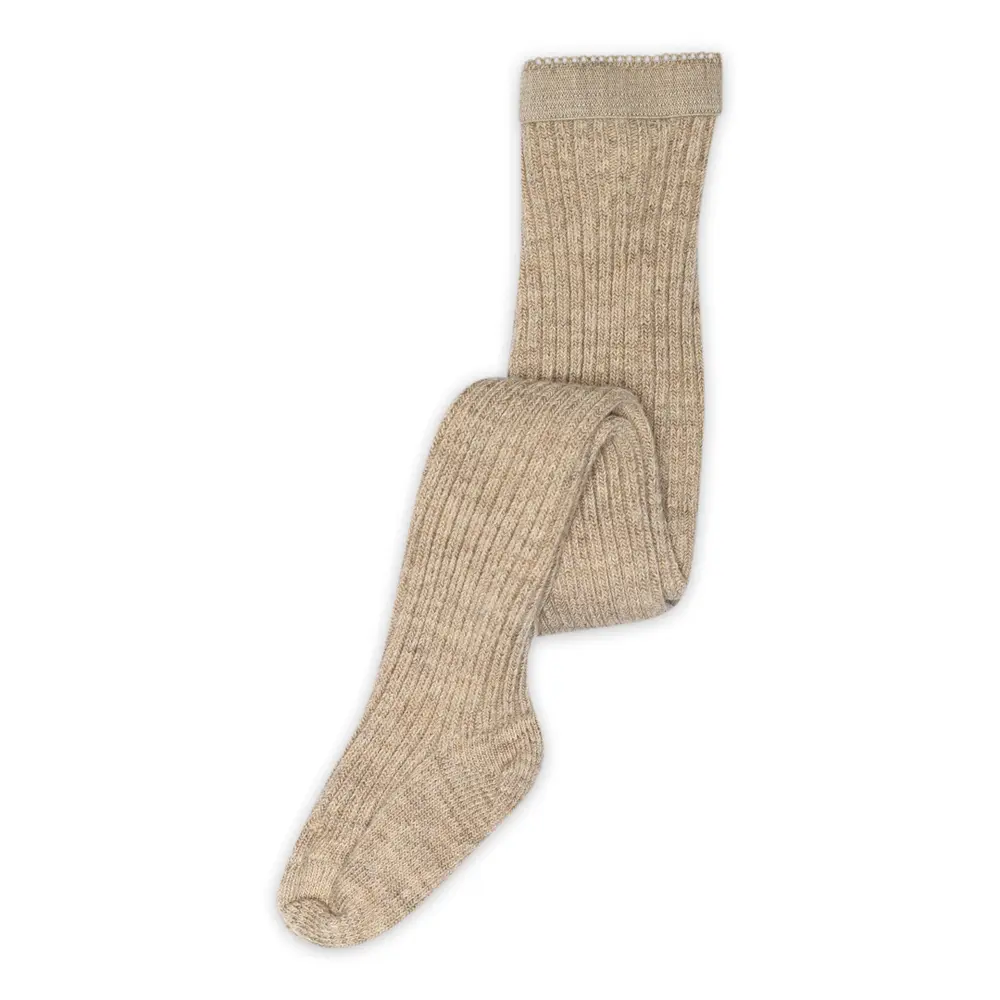 Uldstrømpebukser med bred ribbet struktur fra mpKids. Strømpebukserne er strikket i en blanding af uld og bomuld, hvor bomuldsgarnet er på indersiden, hvilket gør strømpebukserne bløde mod barnets hud, samtidig med at de bevarer uldens egenskaber.