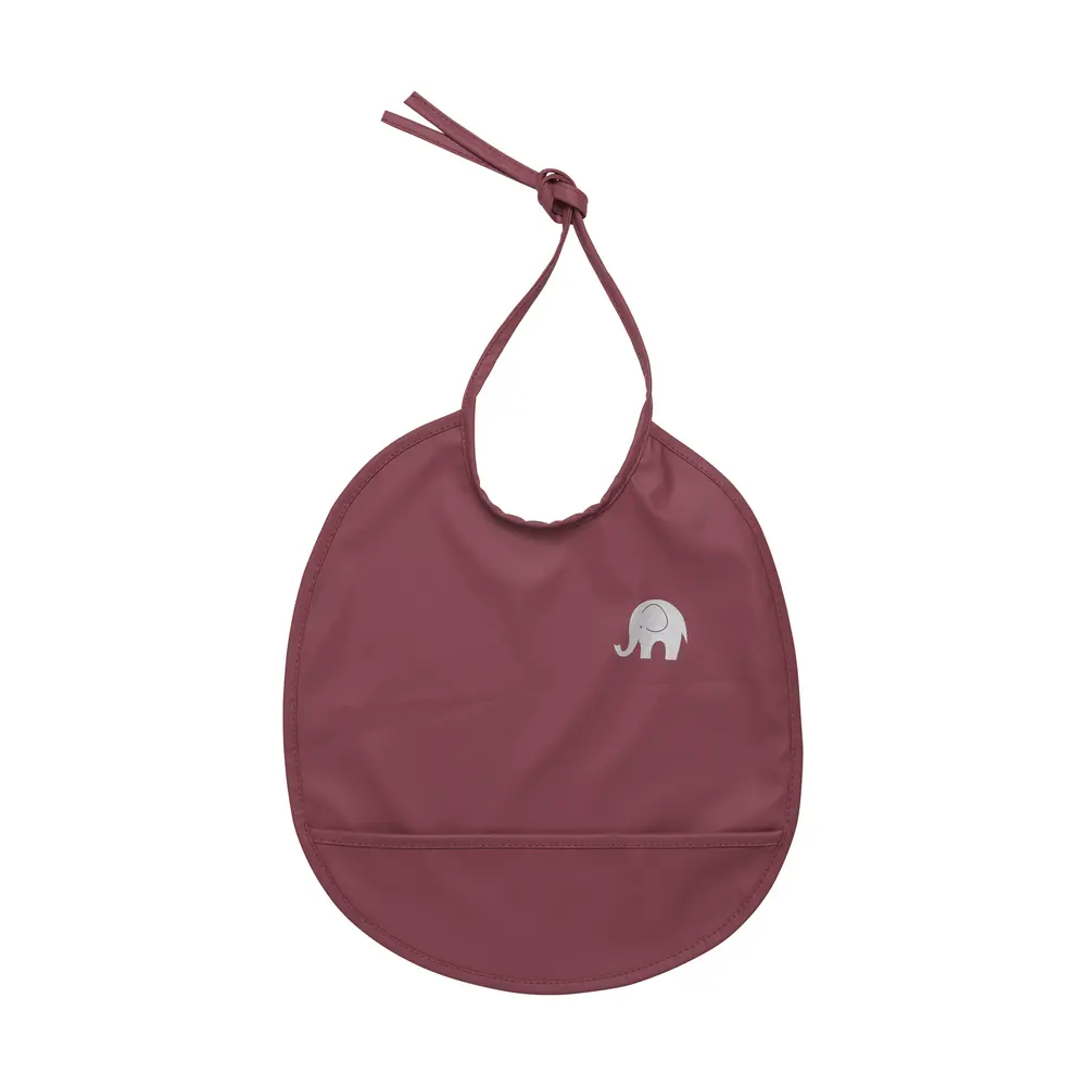 Rund, bred og praktisk hagesmæk fra CeLaVi. Åbnes og lukkes med bindebånd i nakken. Gummibelagt forside gør det nemt at tørre den af efter spisning. Materiale: 38% polyurethane – 62% polyester. Hagesmækken er uden flourstoffer.