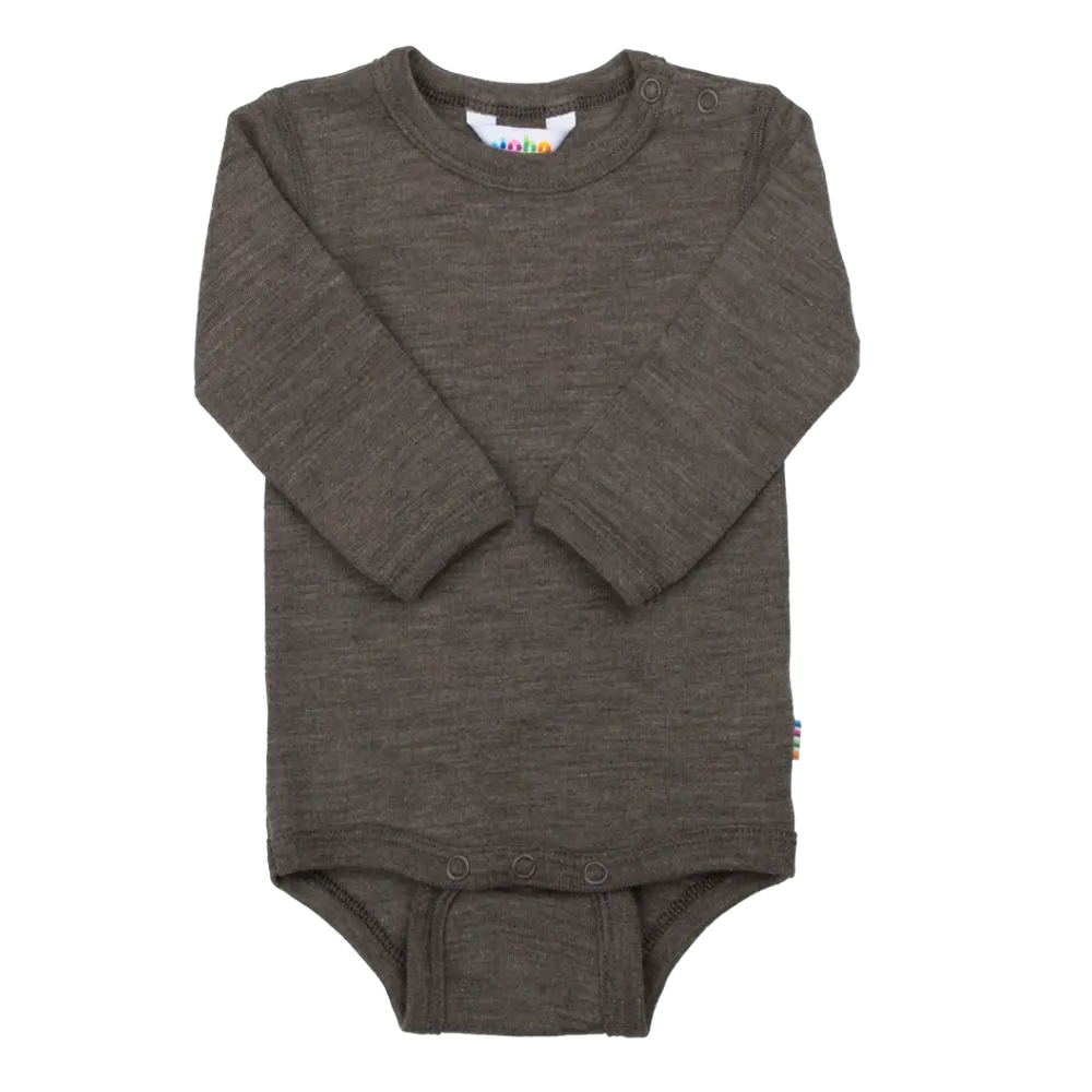 Langærmet body med praktiske trykknapper på den ene skulder og mellem benene, som gør den nem at tage af og på. Fremstillet i en lækker, let og superblød uldkvalitet med silke, der giver både komfort og bevægelsesfrihed. Det melerede stof tilfører et eleg