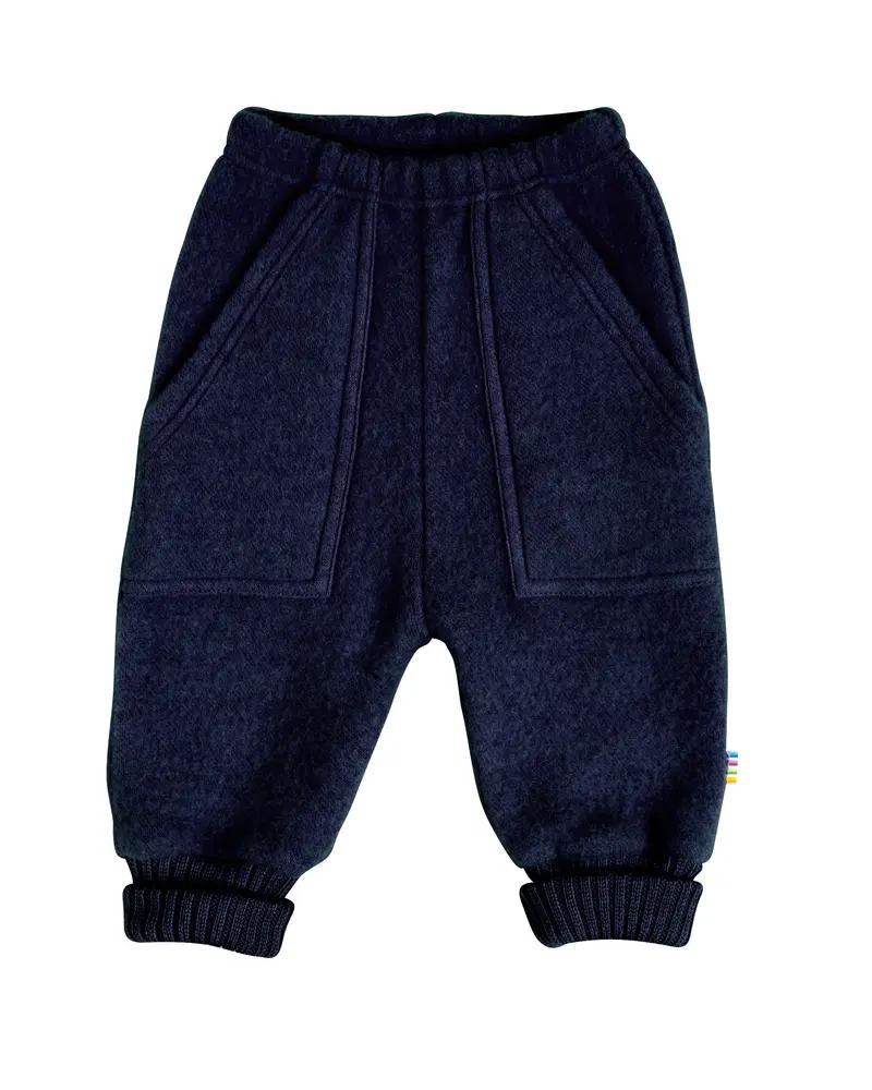 Baggy bukser. Blød elastik i taljen. Store sidelommer som sød detalje. Har bred ribkant i benene som kan foldes ned, så banet kan bruge buksrne længere. En kraftigere børstet uldkvalitet som er ekstra blød og lækker.