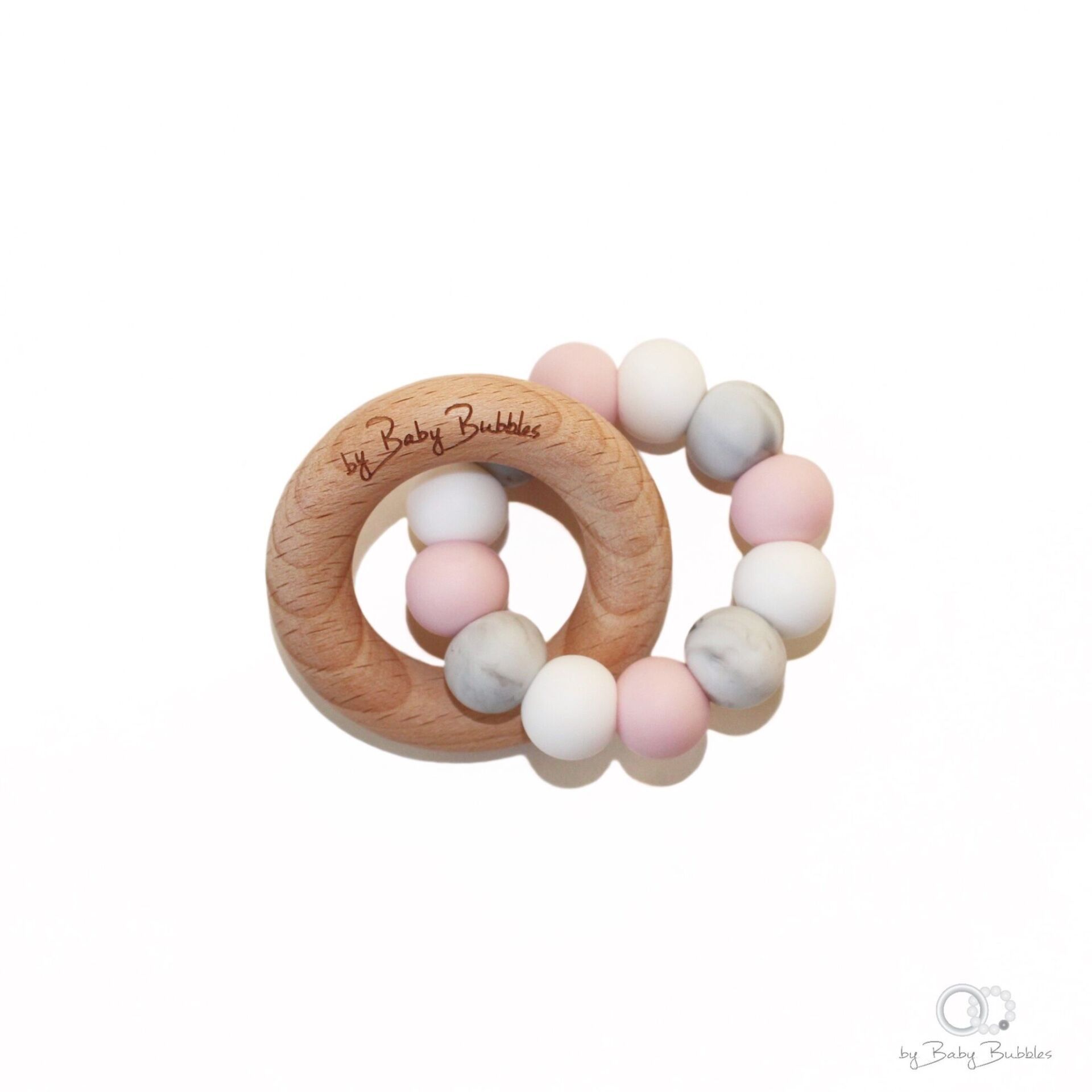 ByBabyBubbles bruger smukt ubehandlet bøgtræ og fødevarekvalitet BPA fri silikone til at skabe vores håndlavede bideringe, der er tro mod vores filosofi om simpelt, smukt og vigtigst, sikkert design. Begge materialer er almindeligt anvendt til tænder og v