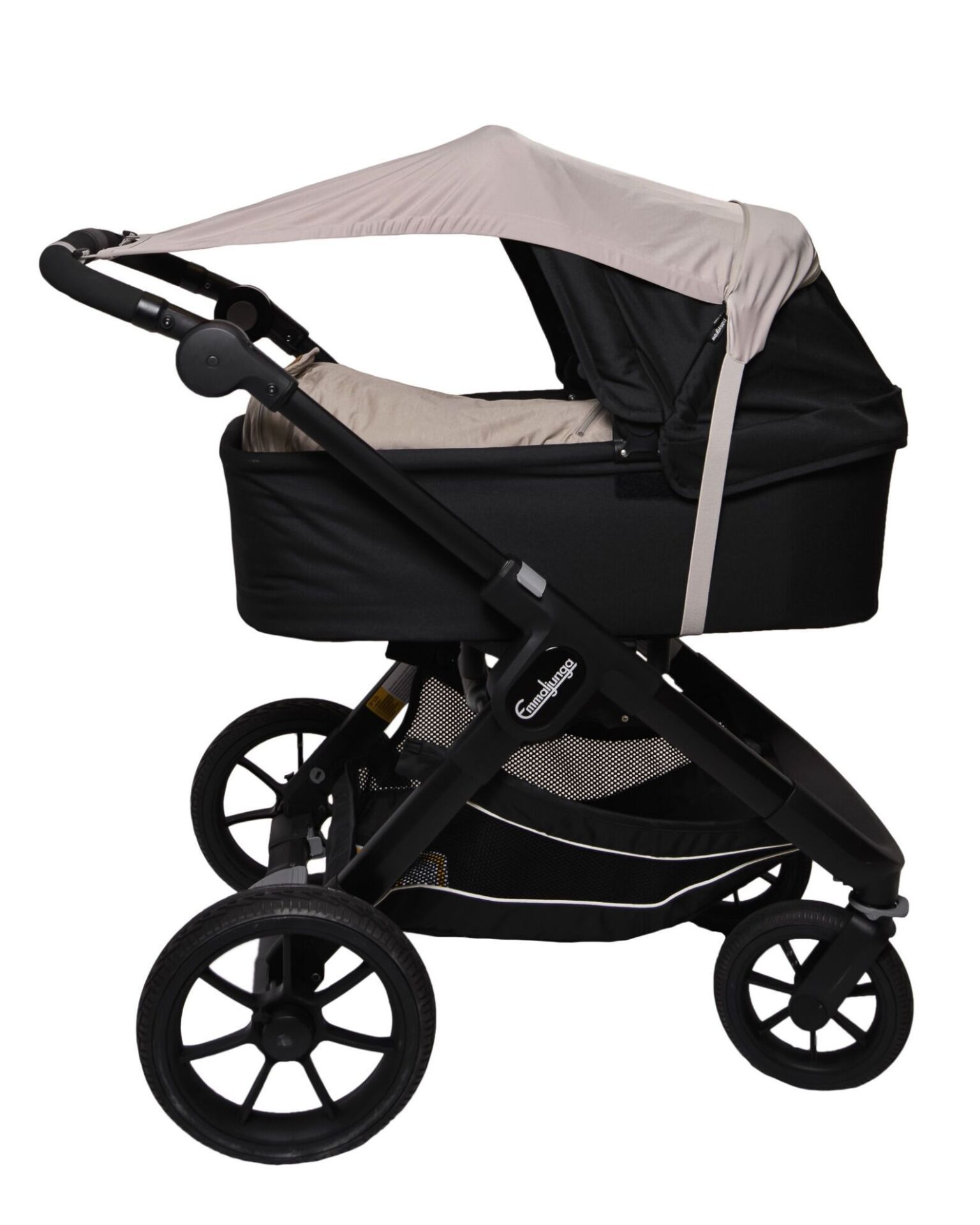 Et super praktisk solskærm til klapvogn og barnevogn. De sættes nemt fast på kalechen med en elastik bagom ryggen/liggedelen. Solskærmen ligge inde i en lang lomme med lynlås. Når solen kommer frem åbner du nemt lommen og tager solskærmen ud. Den har stro