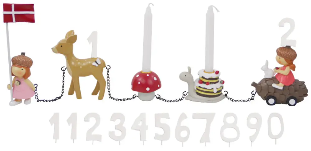 Fødselsdagstog m. 11 tal i det fineste Skovalfer tema. Håndmalet, så ingen er ens. Plads til to talnumre i toget. Inkl. flag. Mål: 17x45x6 cm.