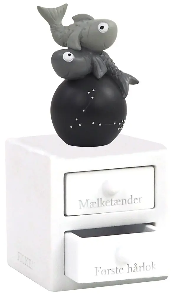 Første tand og hårlok æske med fisken stjernetegn, med planet og stjernebillede, som lyser i mørket. Figuren har to skuffer – En til første tand og en til hårlok. Super fin dåbsgave ide. Æsken er håndmalet så der kan være variationer.