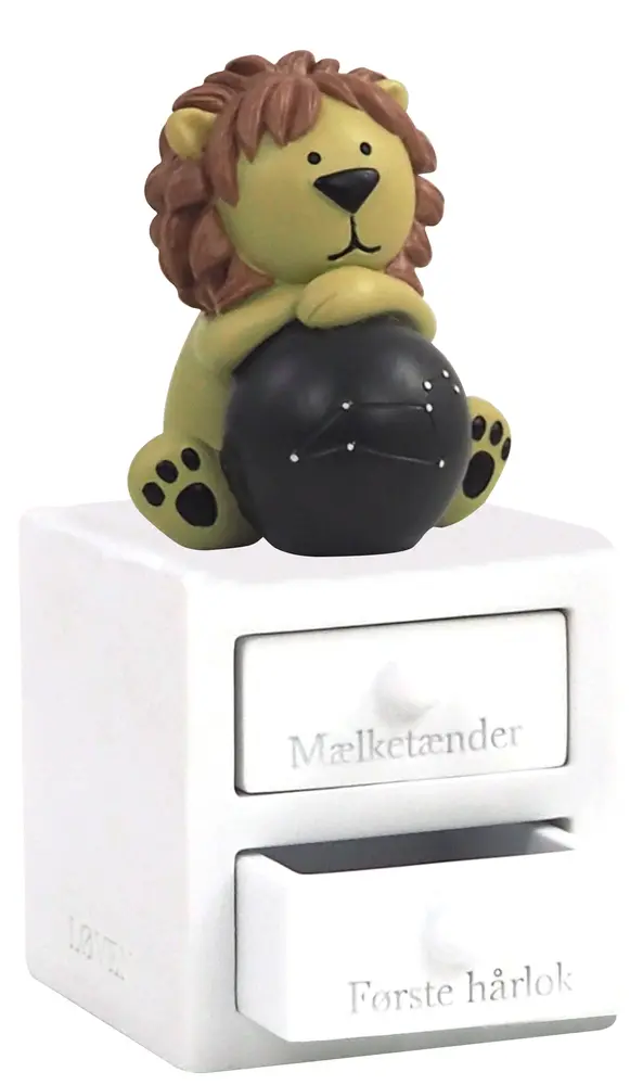 Første tand og hårlok æske med løven stjernetegn, med planet og stjernebillede, som lyser i mørket. Figuren har to skuffer – En til første tand og en til hårlok. Super fin dåbsgave ide. Æsken er håndmalet så der kan være variationer.