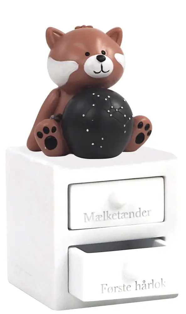 Første tand og hårlok æske med skytten stjernetegn, med planet og stjernebillede, som lyser i mørket. Figuren har to skuffer – En til første tand og en til hårlok. Super fin dåbsgave ide. Æsken er håndmalet så der kan være variationer.