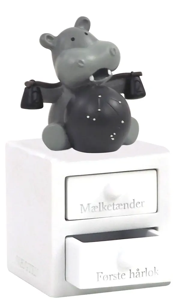 Første tand og hårlok æske med vægten stjernetegn, med planet og stjernebillede, som lyser i mørket. Figuren har to skuffer – En til første tand og en til hårlok. Super fin dåbsgave ide. Æsken er håndmalet så der kan være variationer.
