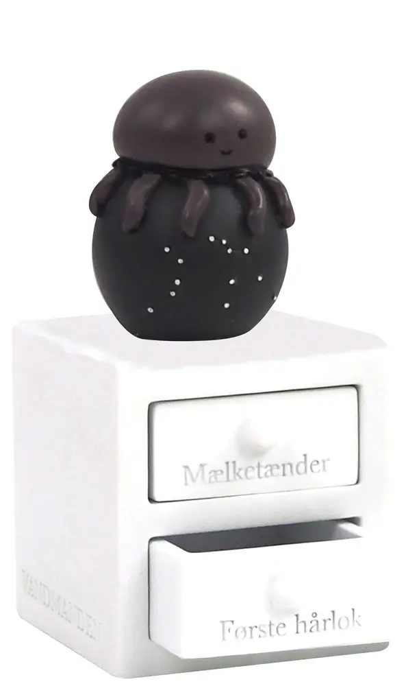 Første tand og hårlok æske med vandmanden stjernetegn, med planet og stjernebillede, som lyser i mørket. Figuren har to skuffer – En til første tand og en til hårlok. Super fin dåbsgave ide. Æsken er håndmalet så der kan være variationer.