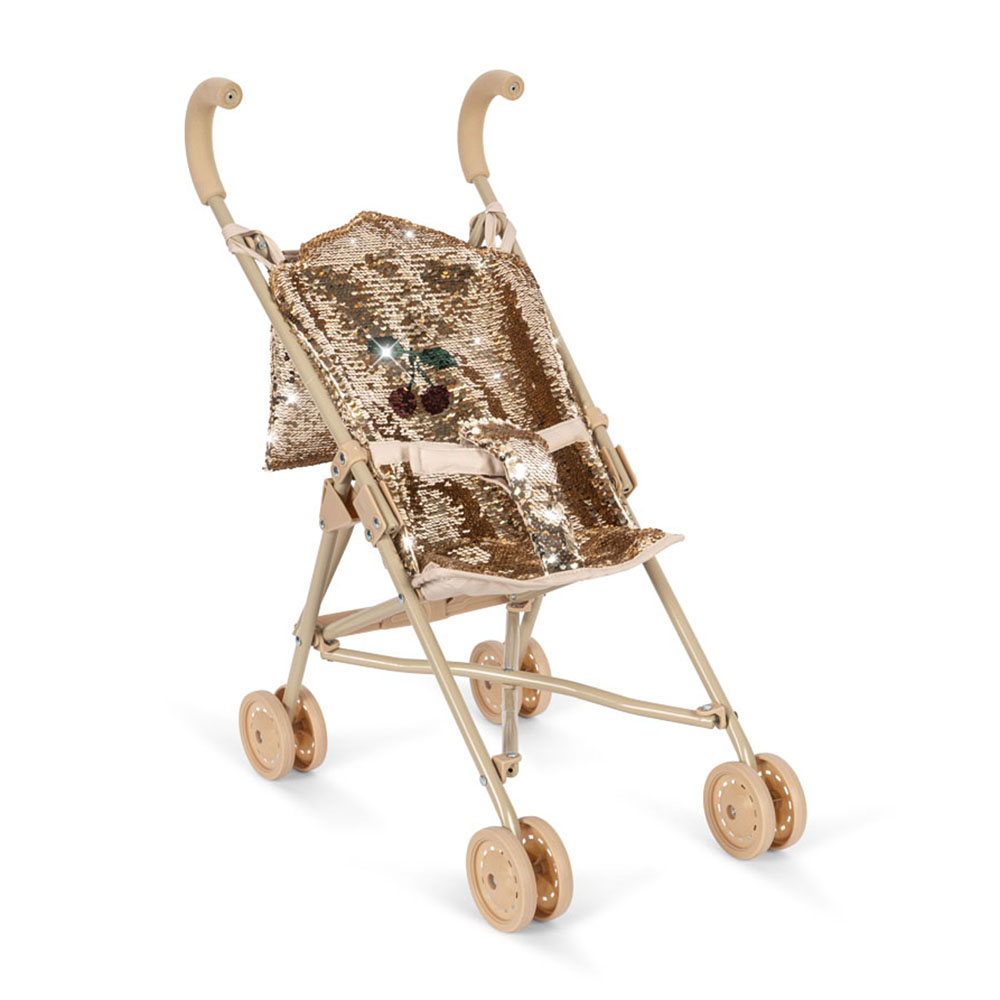 Glitter dukkeklapvogn (One size) Fin dukkeklapvogn i glitter med sele og opbevaringstaske under håndtaget. Klapvognen har 4 dobbelthjul som sørger for ekstra stabilitet. Vognen er beklædt med aftageligt stof lavet af 100% økologisk bomuld. Nem at folde sa