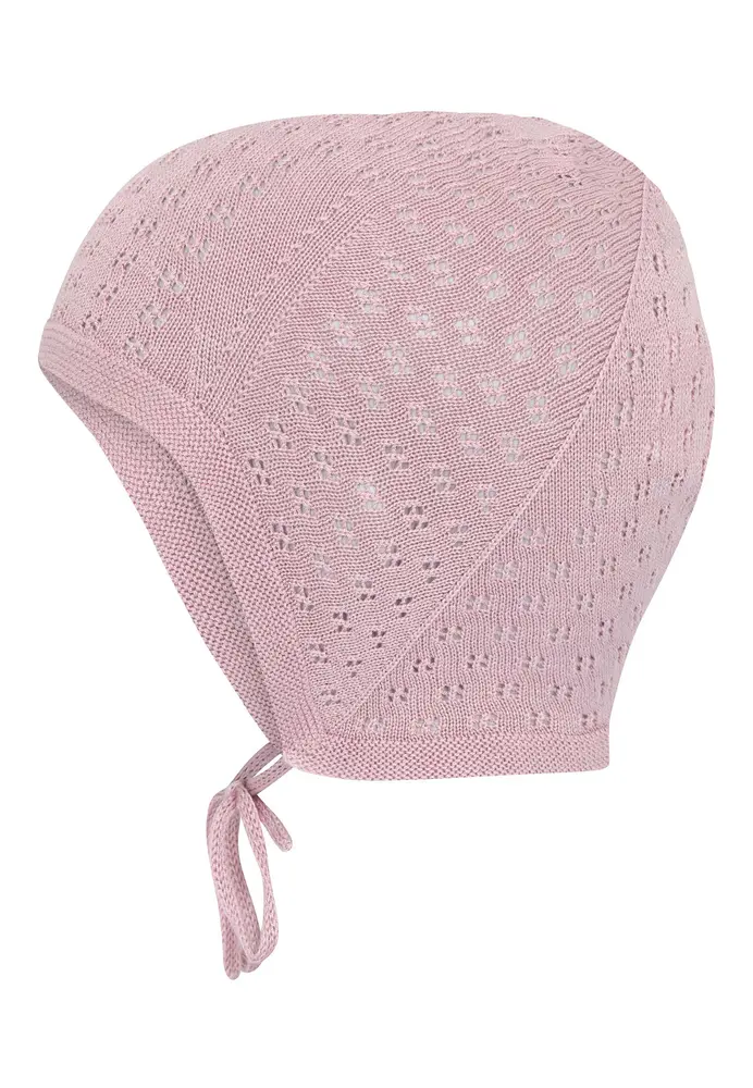 Smuk strikket babyhætte fra mpKids i den blødeste 100% viskose-bambus. Motorhjelmen dækker pande og ører og beskytter mod vinden. De bløde bånd under hagen sikrer, at motorhjelmen bliver på plads.