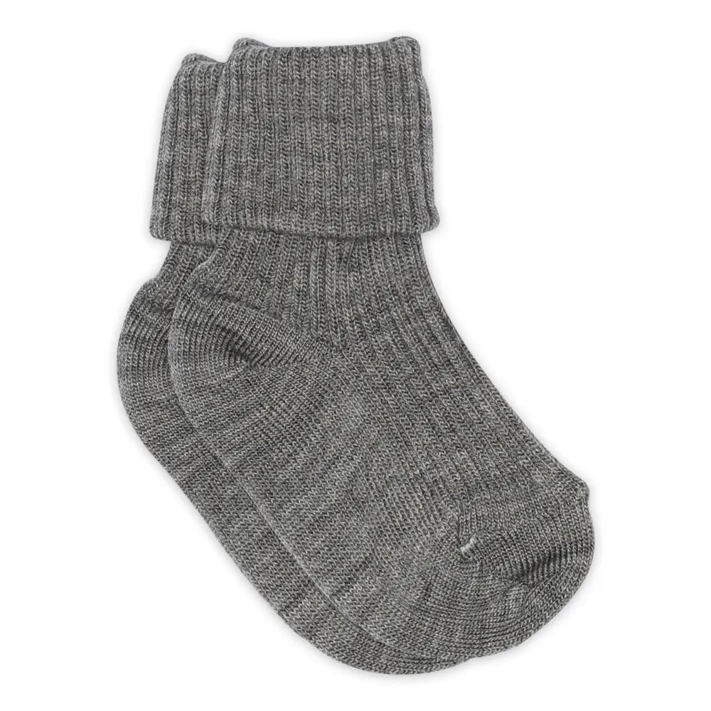 Klassisk ribbet babystrømpe i en blanding af uld og viskose-bambus fra mpKids. Sokkerne er strikket i uld, hvor viskose-bambusgarnet er strikket på indersiden, hvilket gør sokken blød mod babyens hud. For at sikre, at sokkerne har den bedst mulige pasform