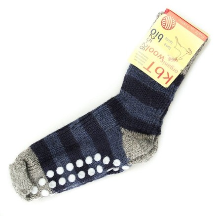 Disse varme uldsokker har dupper under, så barnet ikke glider på gulvet. Så disse sokker til børn kan også fungere som et alternativ til hjemmesko.