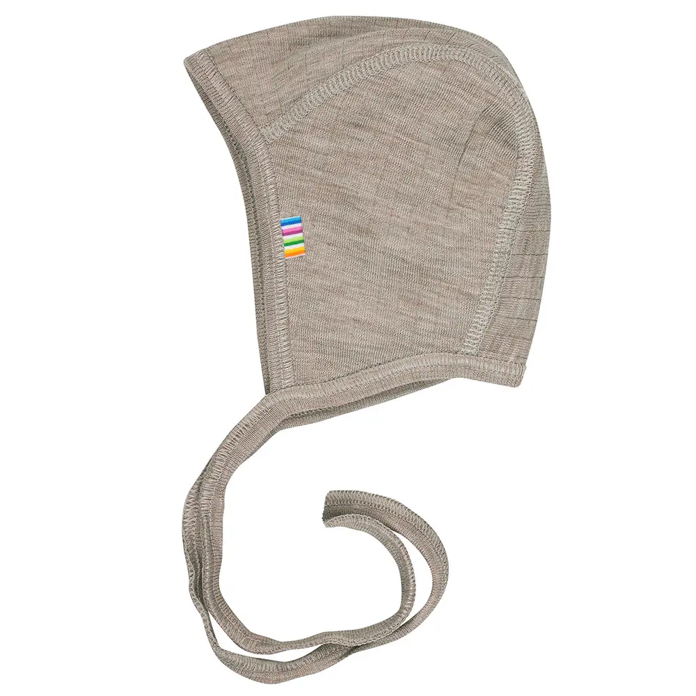 Hjelm med bindebånd. Dobbelt lags. Ensfarvet. Blød, elastisk let uldkvalitet med lodret rille mønster som er behagelig at have. Pure merino wool og Nordic Ecolabel mærket.