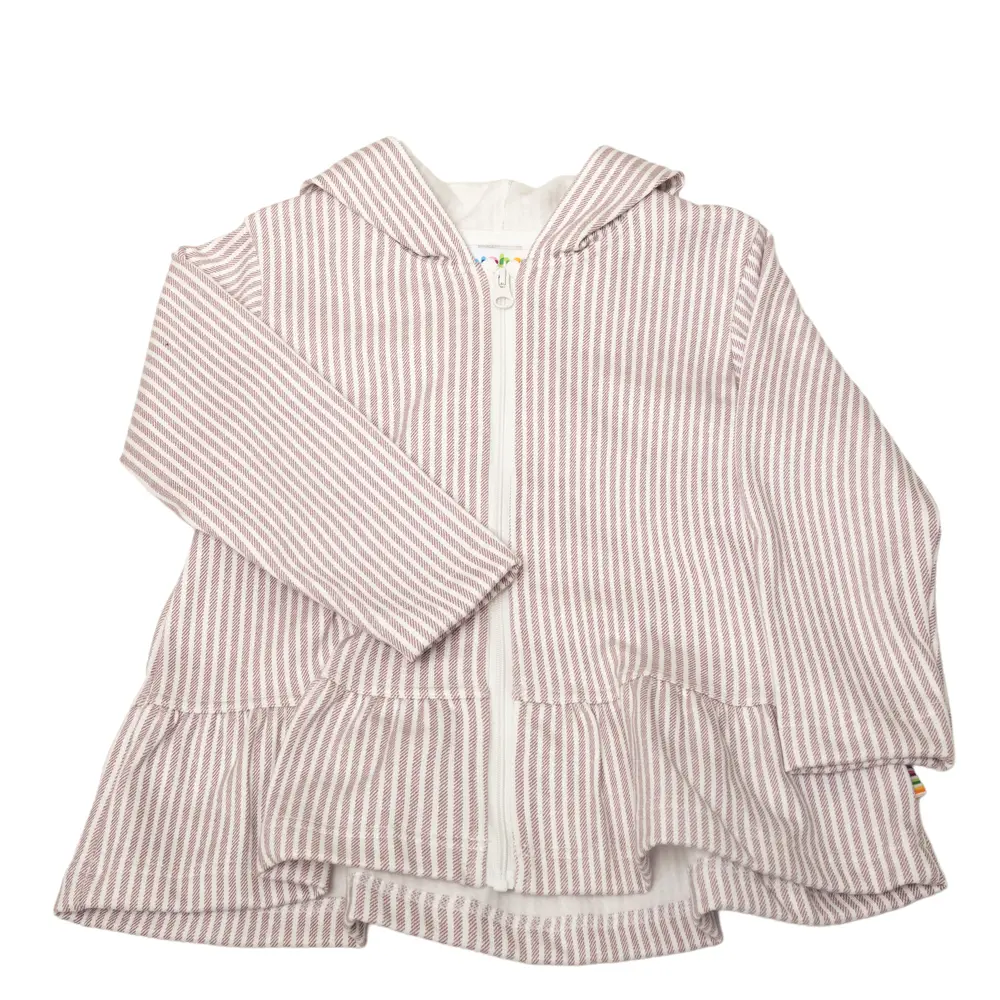Jakke med hætte, lynlås og flæse fornedenn som en sød detalje. En blød og stabil økologisk bomuldskvalitet, som er tæt i strikningen og meget behagelig at have på. Sød stribet print. Oeko-tex 100 mærket.