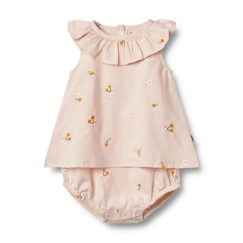 (Indeholder reklamelinks). Ærmeløs sommerdragt med broderi i blød vævet økologisk bomuld til babyer.