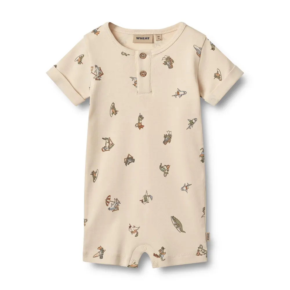(Indeholder reklamelinks). Printet jumpsuit med korte ærmer og ben i blød økologisk bomuld til babyer.