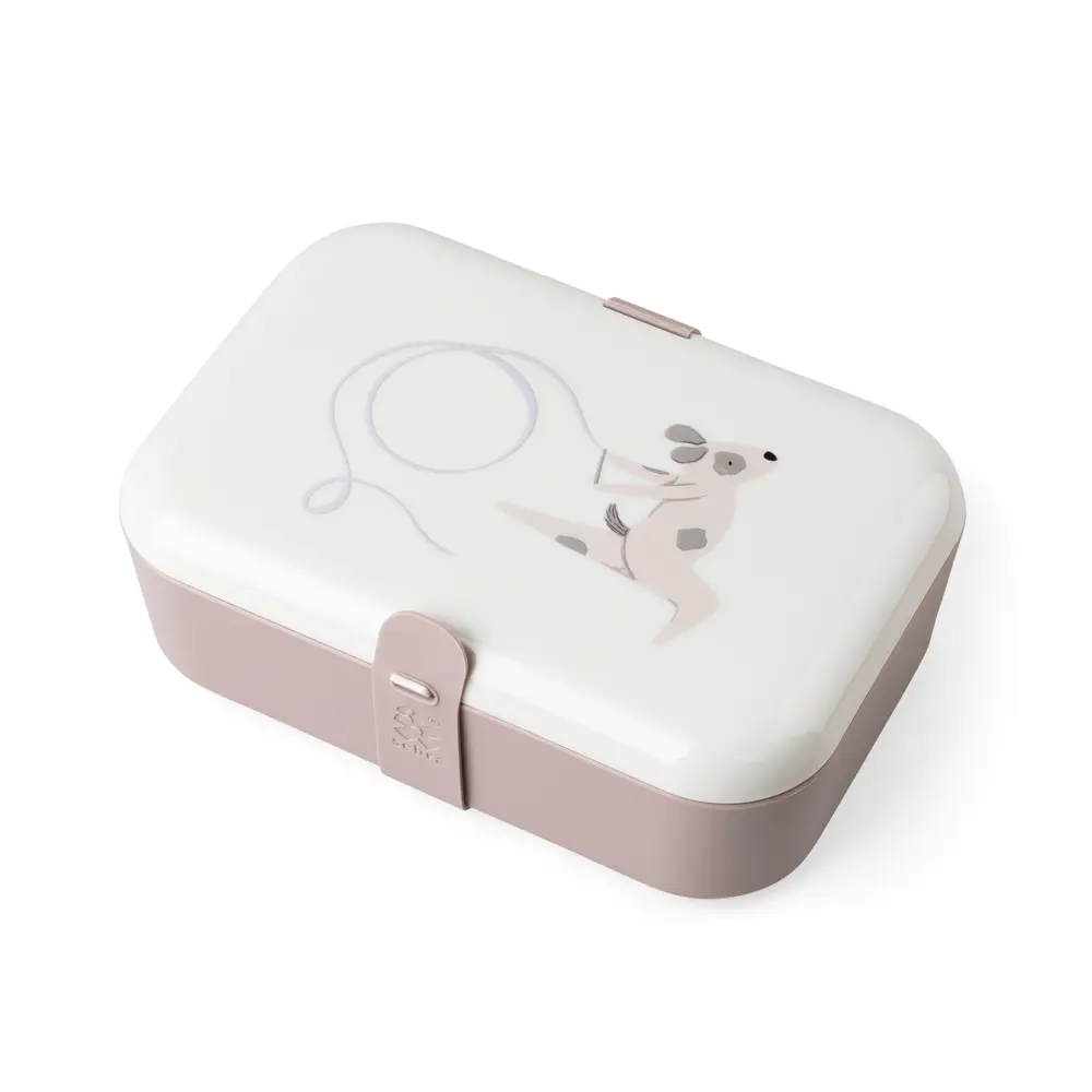 Låget på madkassen holdes på plads af en slidstærk silikonerem, der er nem for små hænder at tage af og sætte på igen. Madkassen kommer med en løs beholder med 2 rum, der fungerer som en rumdeler, hvilket gør det lettere at holde forskellige typer mad ads