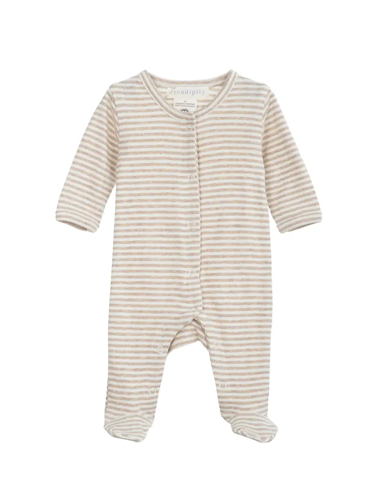 Heldragt til nyfødte i blød rib i striber. Fuld åbning foran og i ben så af- og påklædning er let. Åbnes med trykknapper. 100% blød økologisk bomuld.