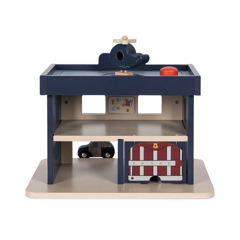 Politistation i træ (One size) Indeholder: 1 brandstation, 1 helikopter, 2 biler. Højde: 25 cm Bredde: 33 cm BLUE MULTI POLICE STATION