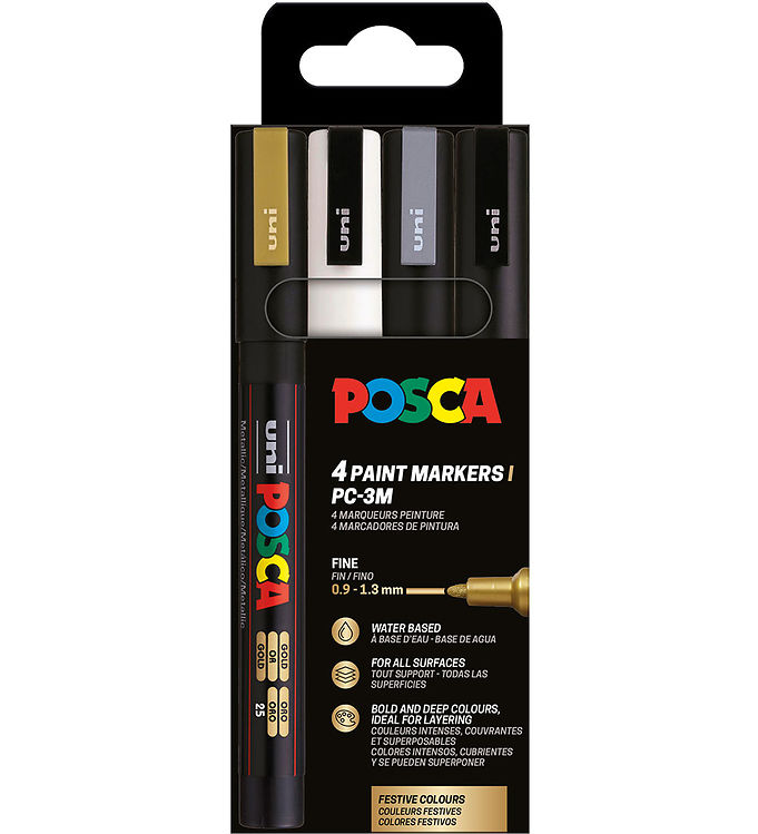 Posca Tuscher – PC-3M – 4 stk. – Guld/Hvid/Sølv/Sort