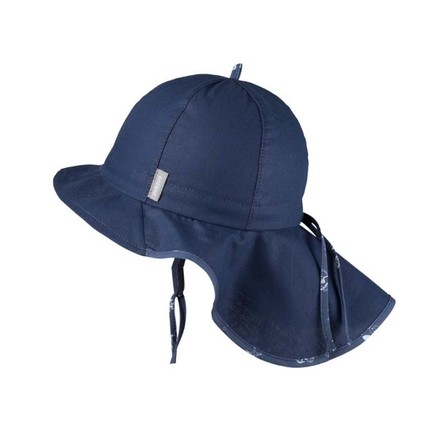 Solhatten er lavet i let stof i marineblå med kant i strandmotiv. Hatten går godt ned bagtil og foran har den også en god skygge. Der er bindeb