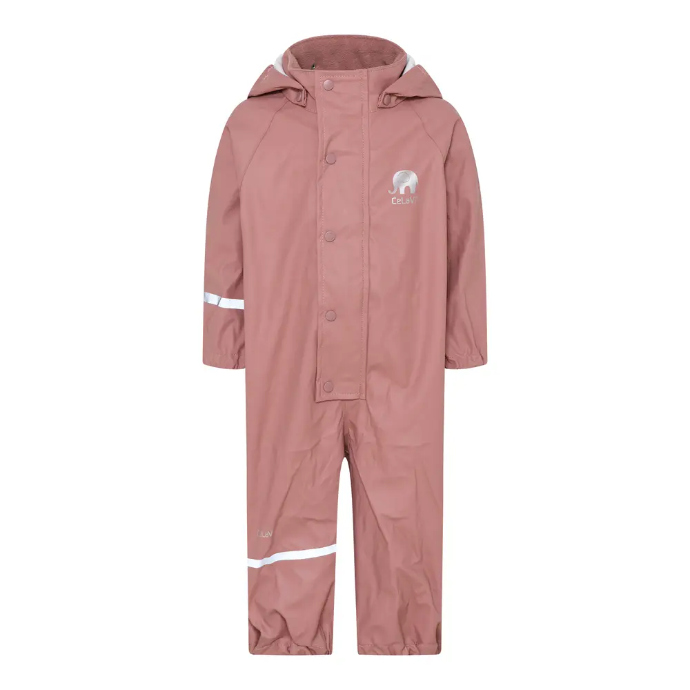 Super praktisk CeLaVi regn dragt i ensfarvet, slidstærkt PU materiale med den søde CeLaVi elefant på brystet. Dragten er vind- og vandtæt med svejsede sømme, og har et målt vandsøjletryk på 5000 mm. Praktisk elastikkant ved håndled og ankler, samt justerb