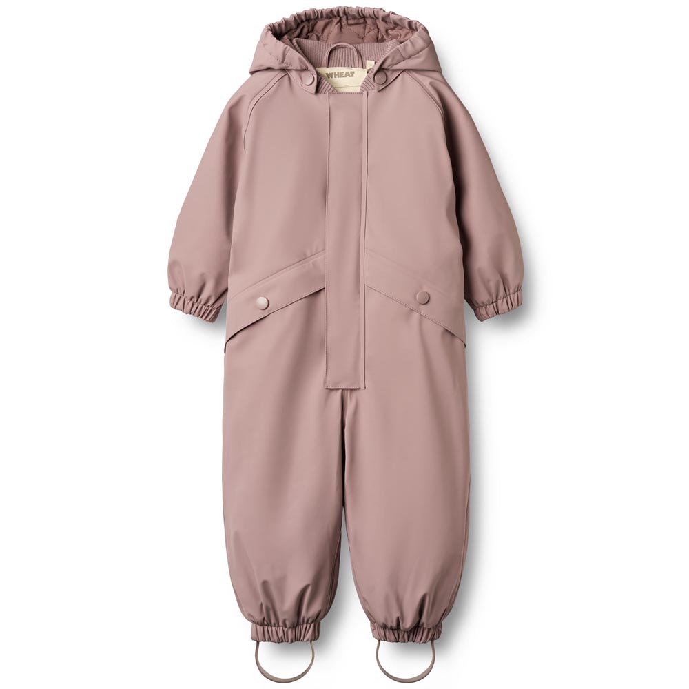 Recycled Aiko termo regndragt (18 mdr/86 cm) – Let polstret med quiltetfoer – Aftagelig og justerbar hætte – Skjult lynlås – Stolpen lukkes med trykknapper – Elastik på bagsiden – Lomme i hver side lukkes med trykknap – Aftagelige fodstropper 1149 dusty l