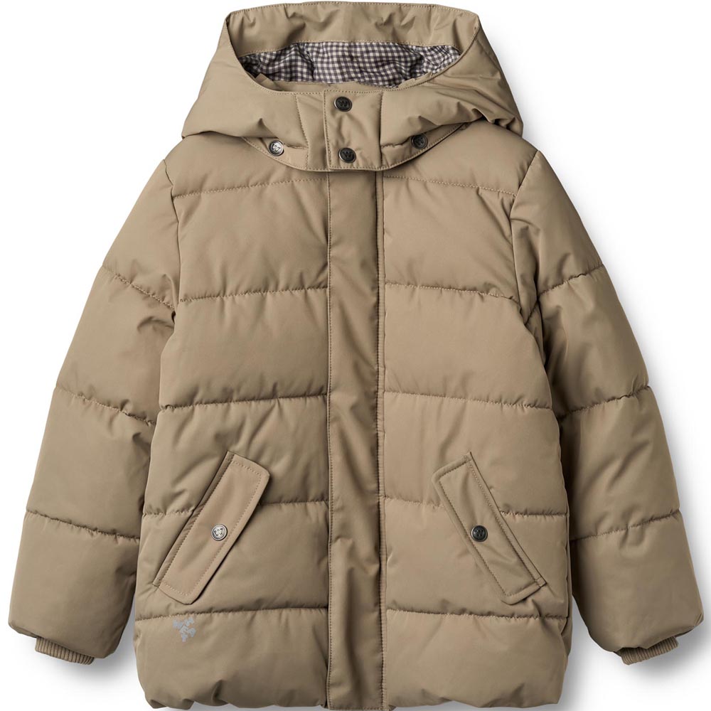 Recycled Gael pufferjakke (5 år/110 cm) – Aftagelig og justerbar hætte med 2 trykknapper foran – Blød rib ved håndled – Skjult lynlås og stolpe med trykknapper foran – Sidelommer, der lukkes med en flap og trykknap 0099 grey stone Gael