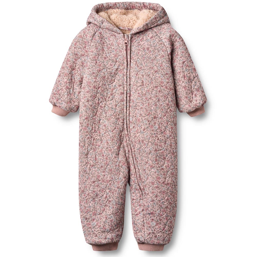 Recycled Krammo termodragt (6 mdr/68 cm) – Fuldt fleecefoer indvendig – Elastikkant i hætten – Raglan ærmer – Rib ved ærme- og benåbning – Skjult lynlås foran 9540 soft lavender flowers Krammo
