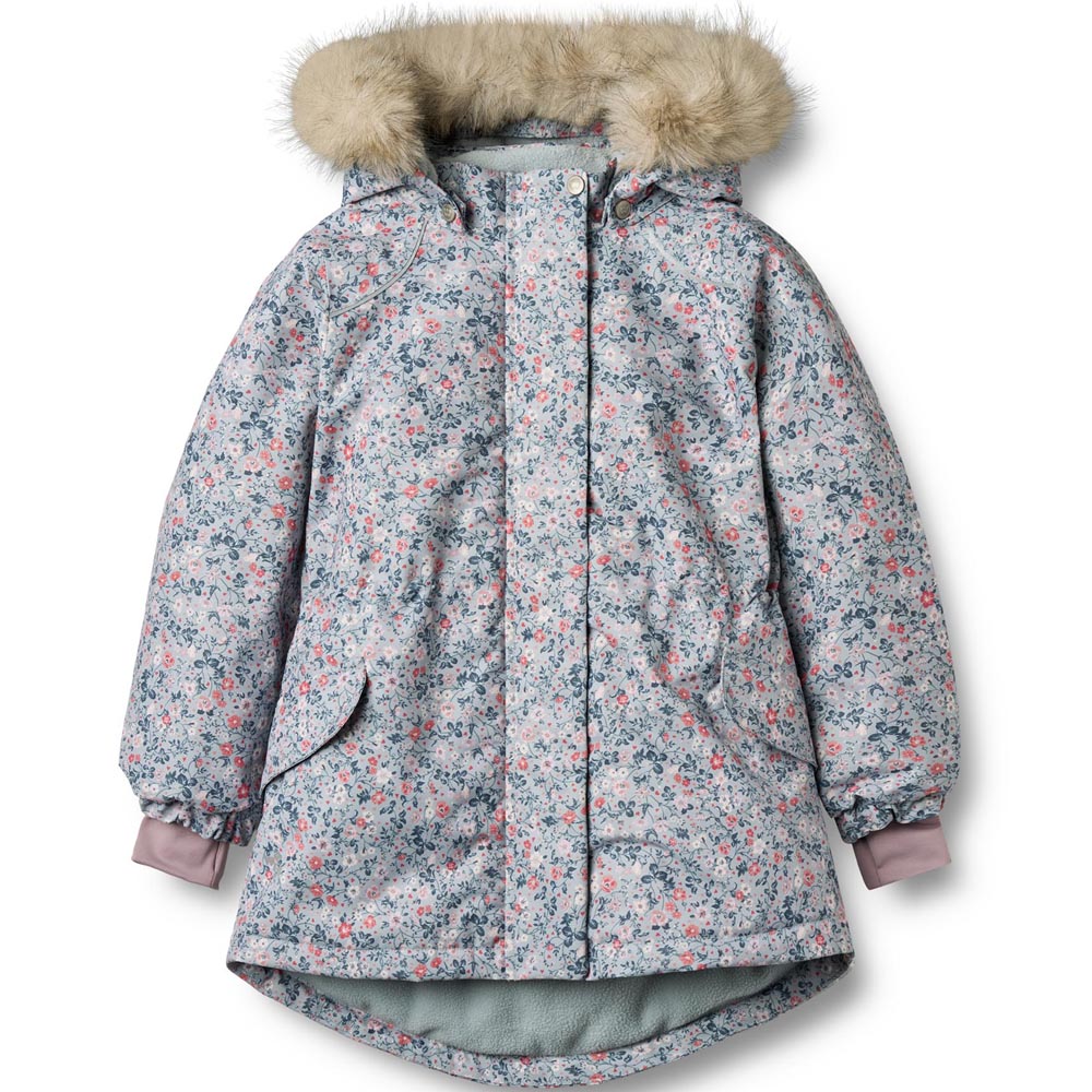 Recycled Mathilde vinterjakke (10 år/140 cm) – Blød fleece indvendig – Justerbare snøre i taljen, der sikrer optimal pasform – Læg på ryggen – Aftagelig og justerbar hætte med aftagelig pels – Skjult lynlås og stolpe med trykknapper 9541 soft rain flowers