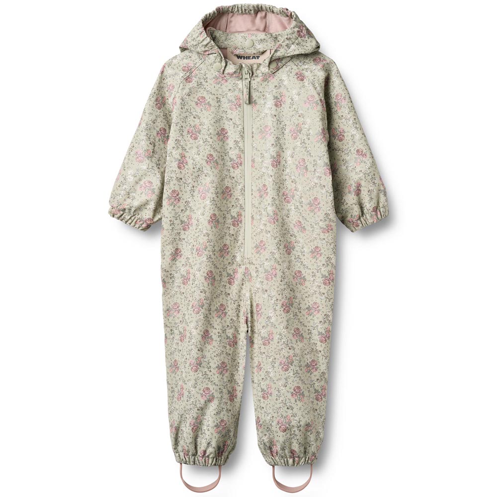 Recycled Mika regndragt (3 år/98 cm) – Vandtæt lynlås og hagebeskytter – Aftagelig og justerbar hætte – Elastik bagpå – Elastik ved ærme- og benåbning – Aftagelige og justerbar fodstropper i gummi 9539 slightly green flowers Mika