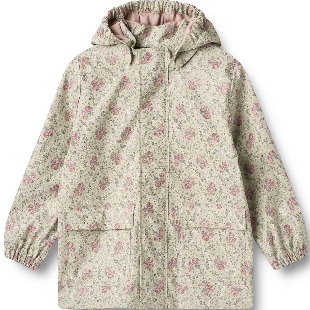 Recycled Ollo regnjakke (3 år/98 cm) – Aftagelig og justerbar hætte – Lomme med klap og trykknap i hver side – Skjult lynlås foran – Stolpe lukkes med trykknapper – Elastikkant ved hætte og begge håndled 9539 slightly green flowers Ollo