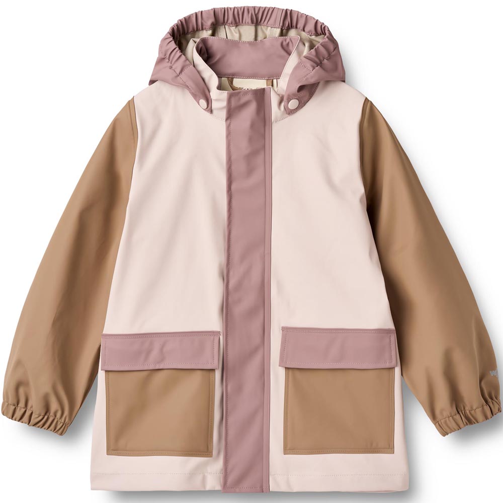 Recycled Otu regnjakke (5 år/110 cm) – Aftagelig og justerbar hætte – Lomme i hver side med lommeflap – Skjult lynlåslukning – Stolpe med trykknapper – Elastikkant ved ærmeåbning og hættekant 1571 soft lavender Otu