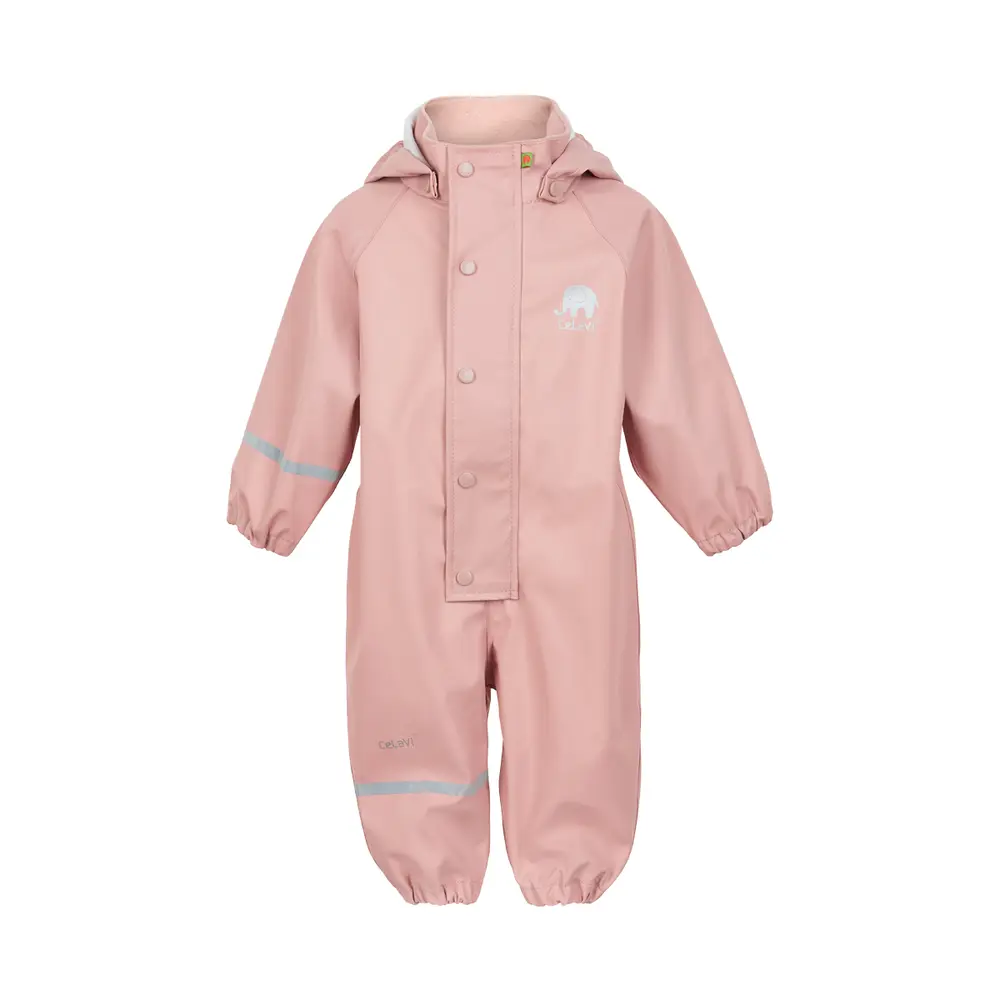Super praktisk CeLaVi regn dragt i ensfarvet, slidstærkt PU materiale med den søde CeLaVi elefant på brystet. Dragten er vind- og vandtæt med svejsede sømme, og har et målt vandsøjletryk på 5000 mm. Praktisk elastikkant ved håndled og ankler, samt justerb