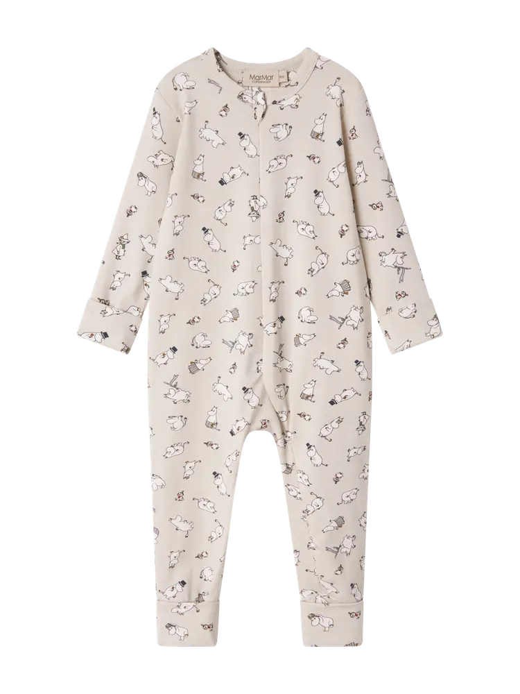 Enkel langærmet heldragt der kan lynes helt fra hals og ned langs det ene ben med lynlås for nem bleskiftning. Heldragten har ombuk ved både ærmer og ben, som kan justeres i takt med barnets væks. Heldragten har ydermere foldbar vante/strømpe funktion fra