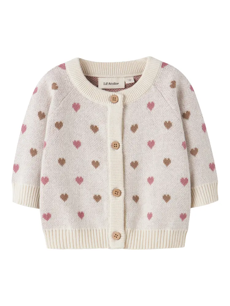 (Indeholder reklamelinks). Blød og behagelig strikcardiganUnikt hjerte-mønsterSmuk farve: TurtledoveKnaplukning foranFra Lil’ Atelier