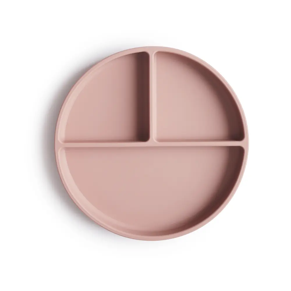 Mushie tallerken med skridsikker bund. Tallerken i silikone med sugekop i bunden, hvilket sikrer, at tallerkenen ikke rykker sig, når baby spiser sin mad. Den er opdelt i tre, så det er muligt at opdele maden. Tallerkenen har en god størrelse, og den klæb