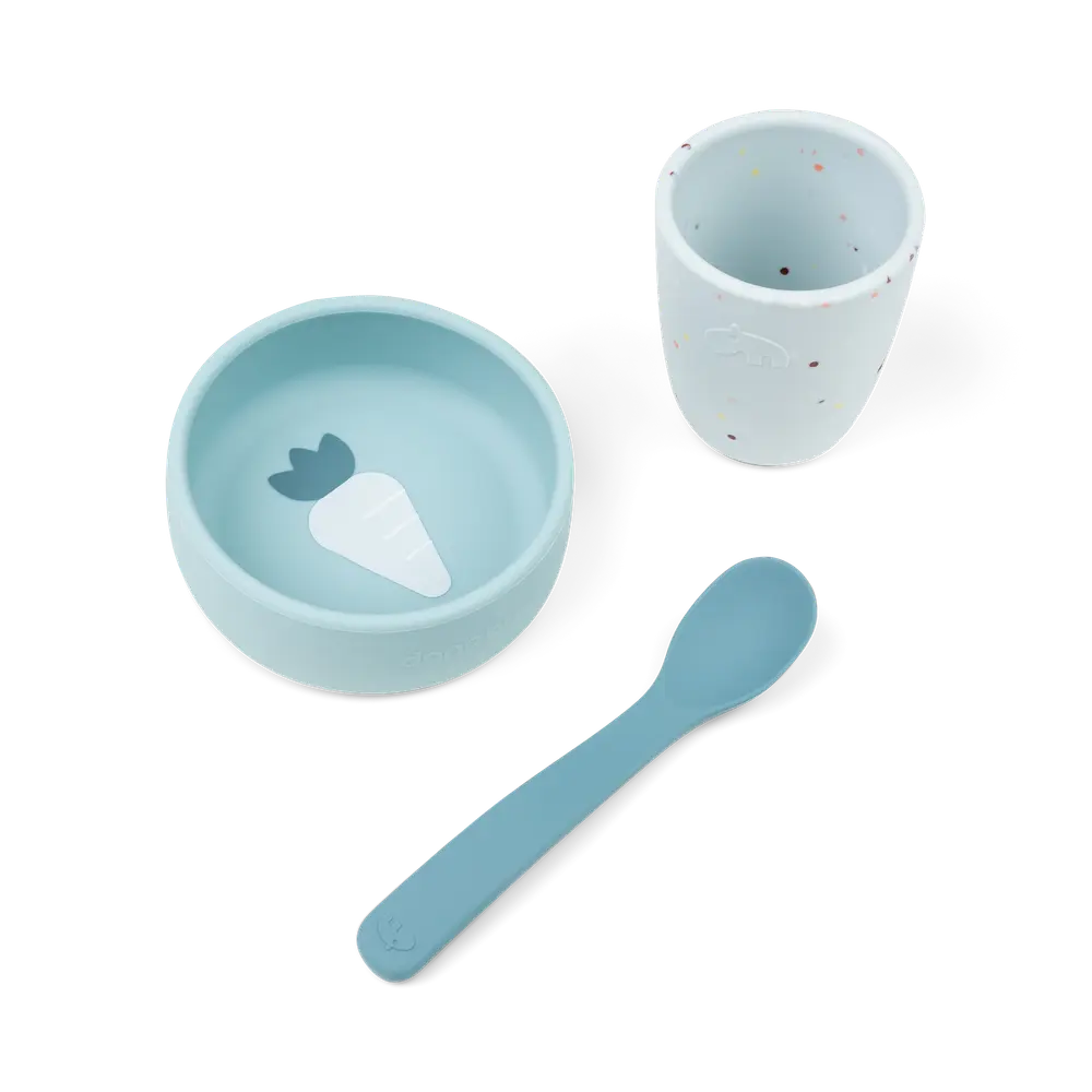 Det praktiske spisesæt i silikone består af en kop, en skål og en ske og har den perfekte størrelse til at de små hænder kan gå på opdagelse i madens verden. Silikone er varmebestandigt og derfor velegnet til brug i mikrobølgeovn, ovn og fryser. Sættet er