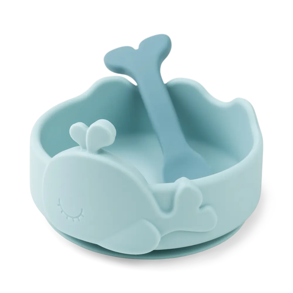 Silikone Stick & Stay skål og ske er designet til de små, der skal i gang med at udforske en verden af smag. Wally svømmer en tur rundt i skålen og halen på skeen underholder, når den dykker ned i maden. Sættet har den perfekte størrelse til de mindste. G
