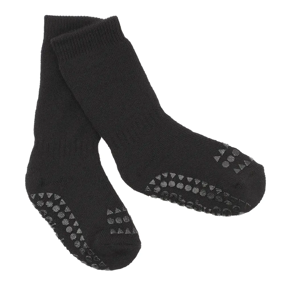 Skridsikre dupper under foden og på tæerneBlød og åndbar bomuldskvalitetEkstra tyk frotté for komfort og varmeStærk elastik i skaftet for god pasformVelegnet til både leg og afslapningGOBABYGO Skridsikre Strømper Terry Bomuld i farven CHOCOLATE er designe
