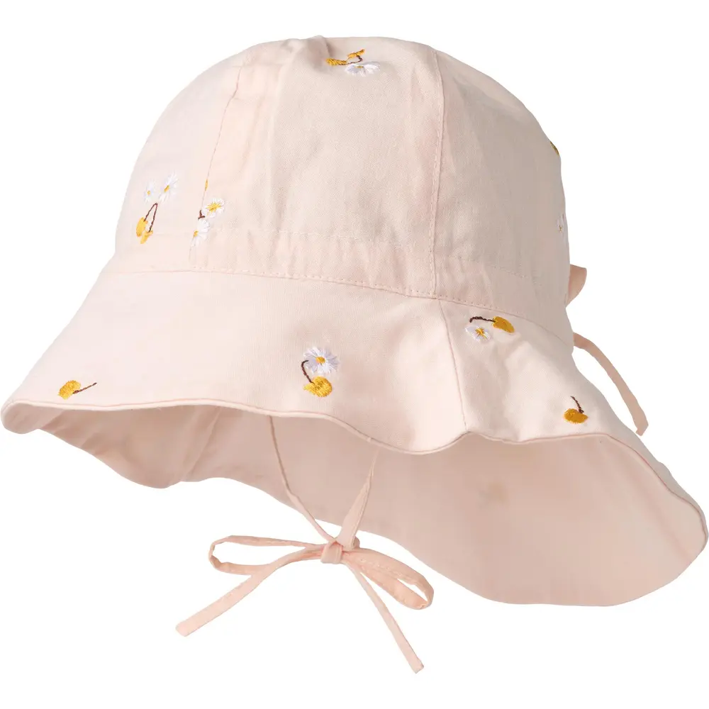 (Indeholder reklamelinks). Solhat med broderi i vævet økologisk bomuld til babyer.
