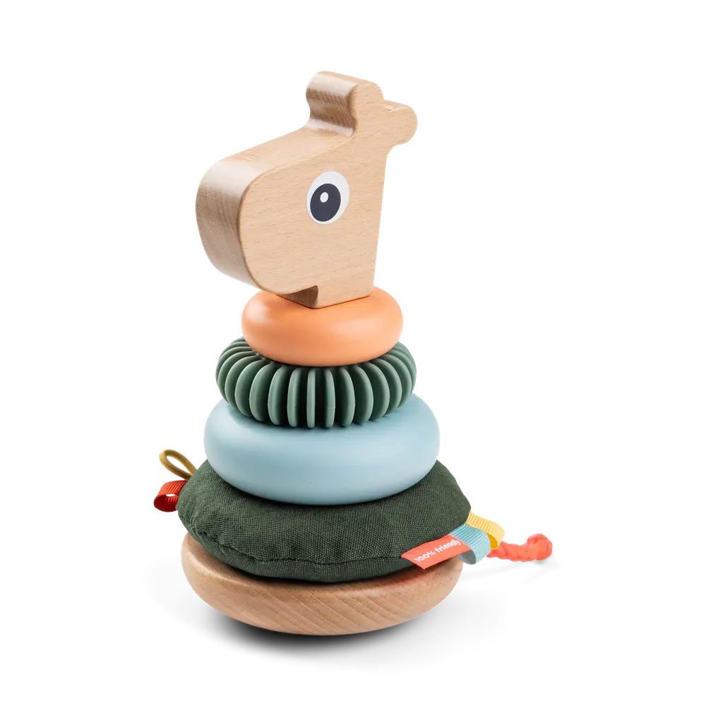 Raffi stabletårn har fire ringe, som den lille udforsker kan stable for at bygge giraffens krop. Lad dit barn opleve de mange sanselige, stimulerende overflader og detaljer – der vil være mange timers leg med den nye søde ven, Raffi. De fire ringe er lave