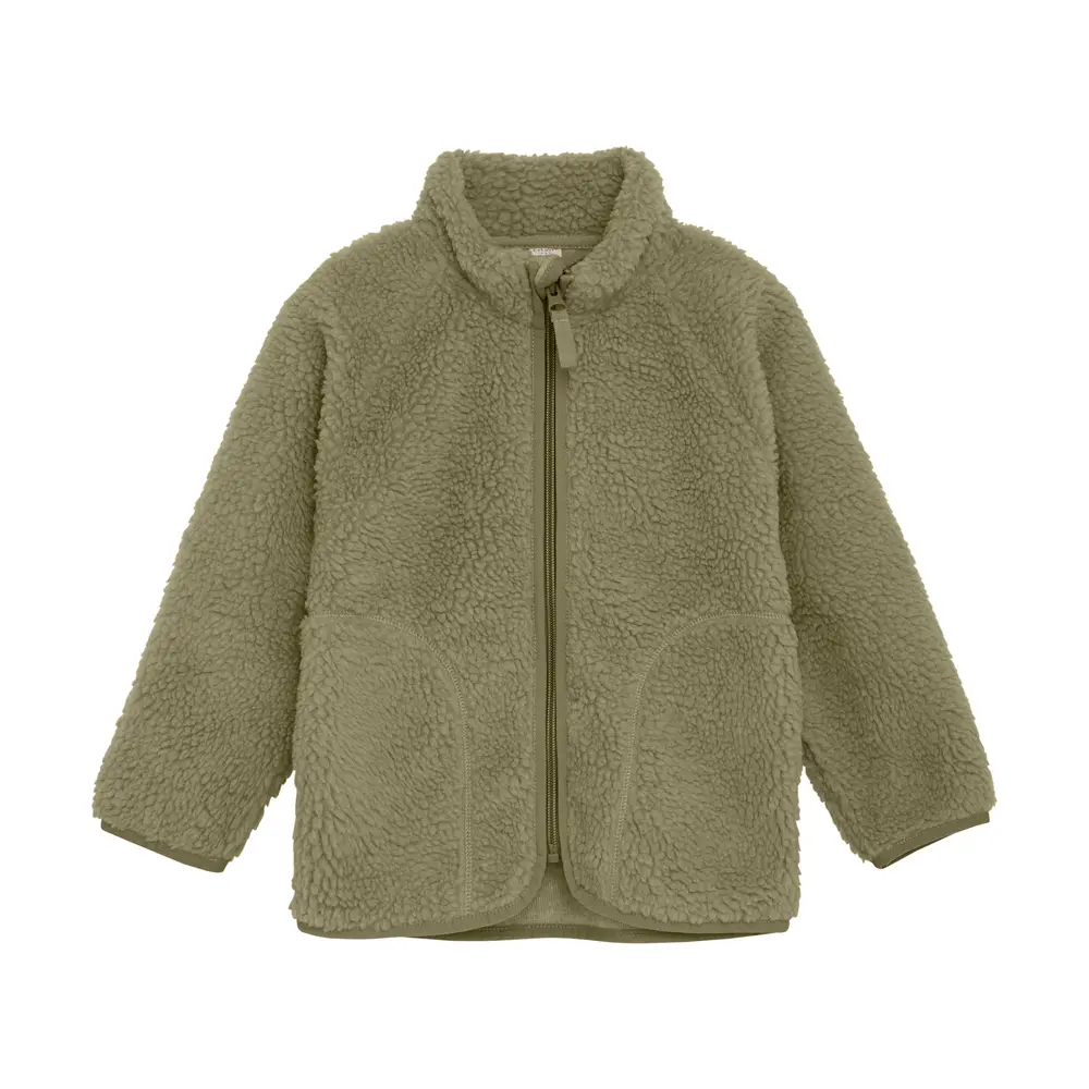 Denne ensfarvede teddyjakke er både blød og varm, perfekt til kølige dage. Jakken har praktiske lommer og lukkes foran med en kvalitets lynlås, der gør den nem at tage af og på.