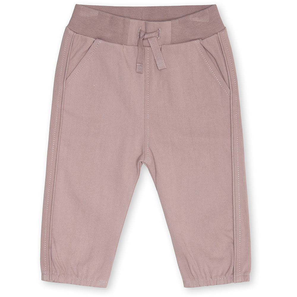 Elastiske twillbukser med rib og bindebånd i taljen. Lille piping i sidesøm. Elastik forneden.