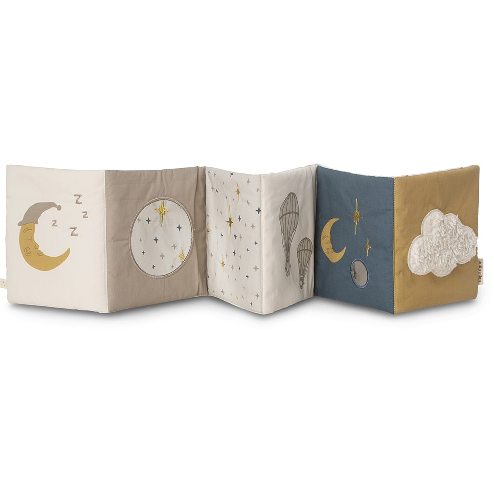 En blød og smuk aktivitetsbog, der stimulerer dit barns forskellige sanser. Stimulér dit barns sanser med lydene, de forskellige strukturer og materialer, spejlet og alle farverne. Du kan købe den i forskellige mønstre og motiver. Stoffet er 100 % økologi