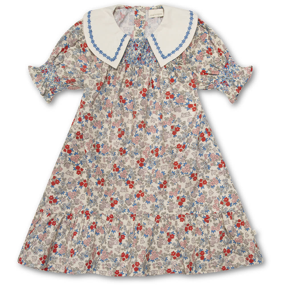 Smuk kjole med fine, delikate detaljer. Kjolen har en længde, der går under knæet og er længere bagtil, hvilket giver et elegant og unikt udtryk. Det elastiske smockmønster på brystet sikrer en behagelig pasform, mens de puffede ærmer med elastik tilføjer