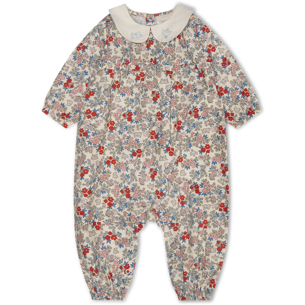 Sød babyromper med vores charmerende blomster- og kaninprint. Den fine krave har en lille blondekant, og elastikken omkring taljen samt ved ærme- og benkanterne sikrer en behagelig pasform. Flæsedetaljen rundt om taljen tilføjer et ekstra sødt touch, der
