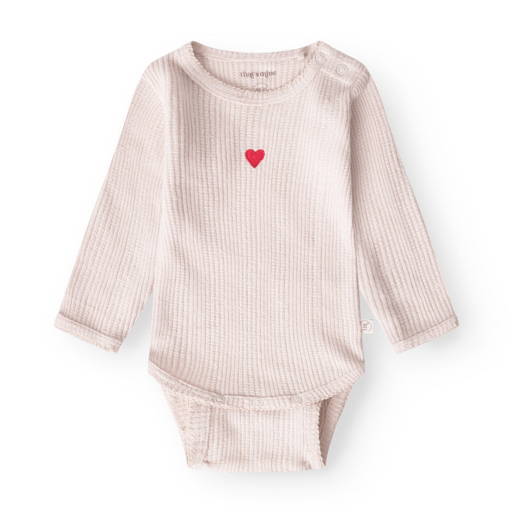 Blød børstet pointelle bodystocking med borderet lille rødt hjerte. Ekstra knapper i bunden, så man lige kan bruge den lidt længere tid. Lavet i blød økologisk bomuld.