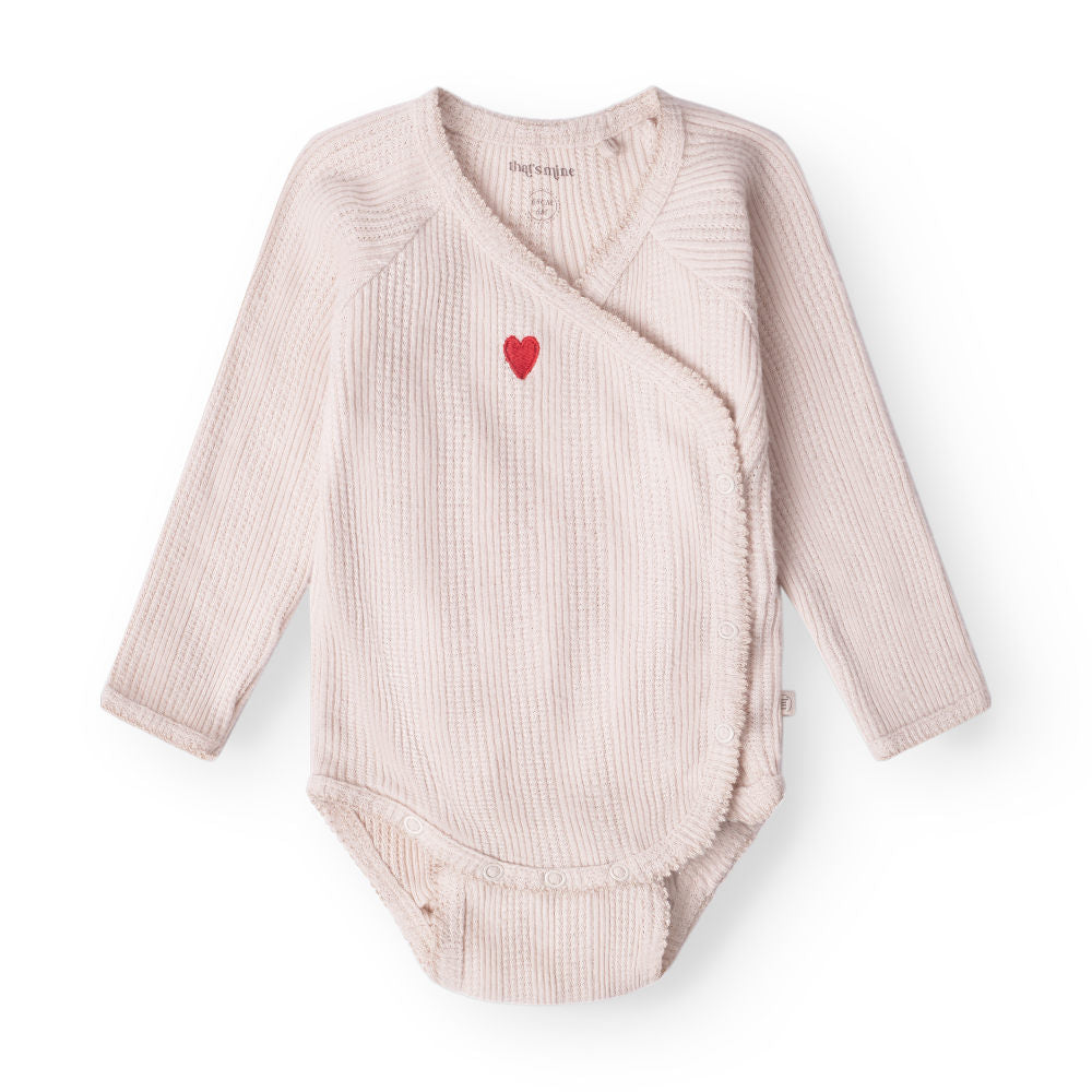 Blød børstet pointelle slå-om bodystocking med borderet lille rødt hjerte. Ekstra knapper i bunden, så man lige kan bruge den lidt længere tid. Lavet i blød økologisk bomuld.
